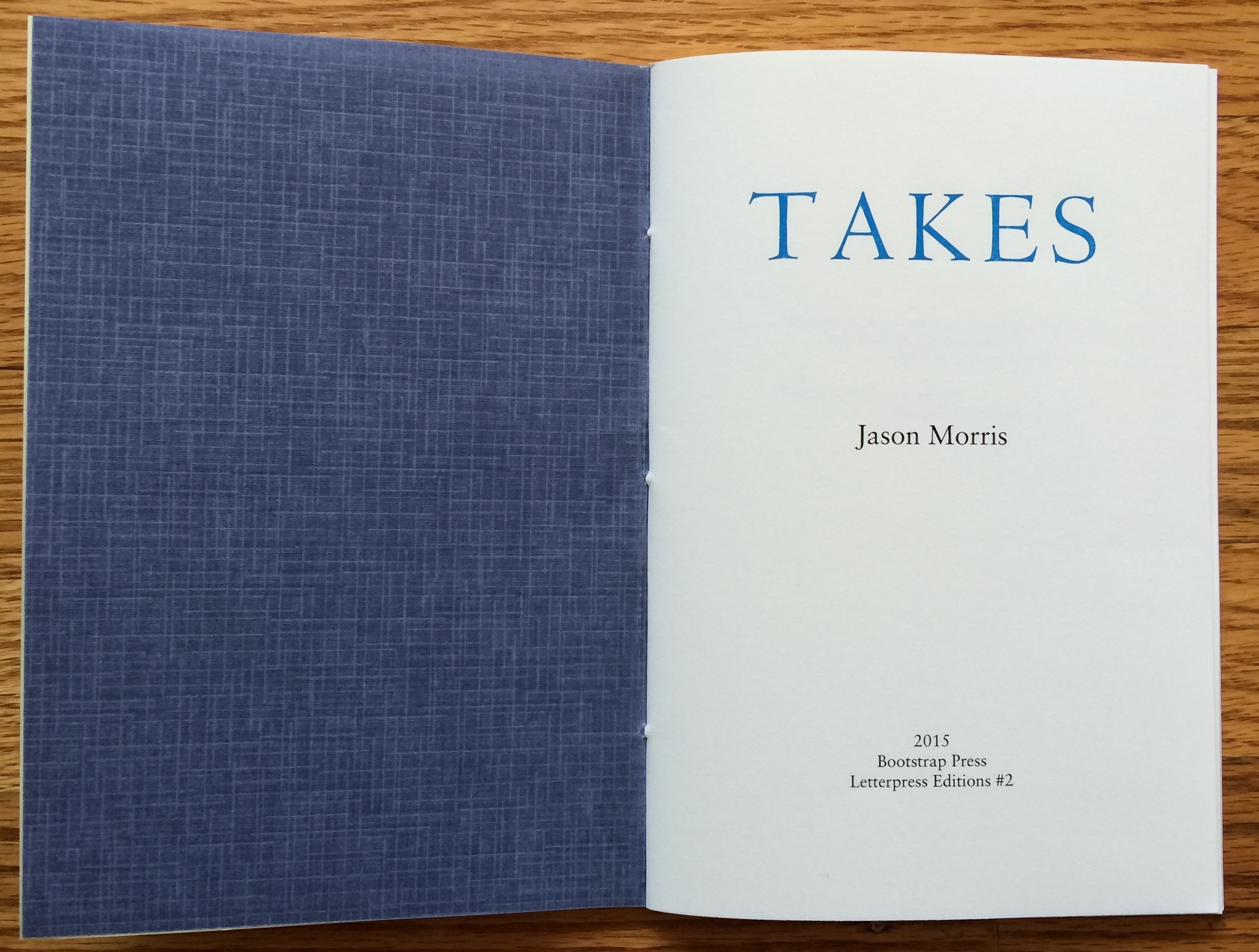 Released on the same day, at the same time, in the same place with Brian Lucas’ Eclipse Babel, was TAKES, by Jason Morris, a chapbook of brief essays and poems published by Bootstrap Press. This is the second of Bootstrap’s new pamphlet series. The poet and the publisher met me down at the San Francisco Center for the Book to collaboratively and spontaneously design and print the cover, and in this case the title page, too.
