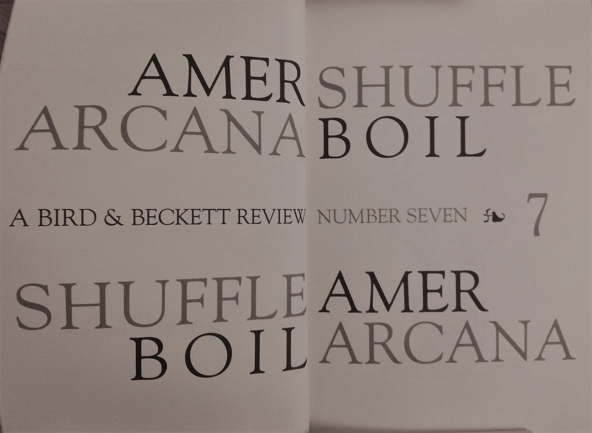 This fall I’ve had precious little time to print, but I have managed to get a couple of projects underway, one of which came to fruition this week when I received 8 boxes of the 7th issue of my roughly annual magazine, AMERARCANA: A Bird & Beckett Review, which was guest edited this time around by poets David Meltzer and Steve Dickison, erstwhile editors of SHUFFLE BOIL: A Magazine of Poets and Music, which ran four single issues (#1-4) from winter 2002 through fall 2003, with a double issue (#5/6) following in 2006, all published under Dickison’s Listening Chamber imprint. Another issue was planned, and some materials gathered, but it never came to be. Since 2010, a few pieces slated for publication therein have made their way into one or another of the first six issues of AMERARCANA; however, what appears here was gathered newly over the last several months. This, then, is #7 of both magazines: 160 pages bound in wrappers designed and printed from hand-set lead type once belonging to William Everson (aka Brother Antoninus) in Santa Cruz, CA. I used Goudy Thirty and Goudy Newstyle for the titles “Amerarcana” and “Shuffle Boil” respectively, shuffling the letters of one title into and out of the other (or vice versa), so in the top and bottom lines the letters alternate, and at center they’re fully separate. The different faces and the ligatures of the Newstyle made it a little more difficult than anticipated, and there’s one wee typo I somehow missed in proofs, but I’m pretty happy with the result. Printed on Fawn Stonehenge paper in blue and brown ink. The interior layout is all in Goudy Oldstyle. Get one here.