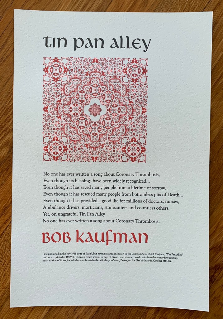 “Tin Pan Alley,” a poem by Bob Kaufman. Libra and Goudy Oldstyle type with 24 pt. lead ornament design. Printed at Impart Ink for Unrequited Records. Proceeds to benefit the poet’s son, Parker. Available here: http://www.unrequitedrecords.com/