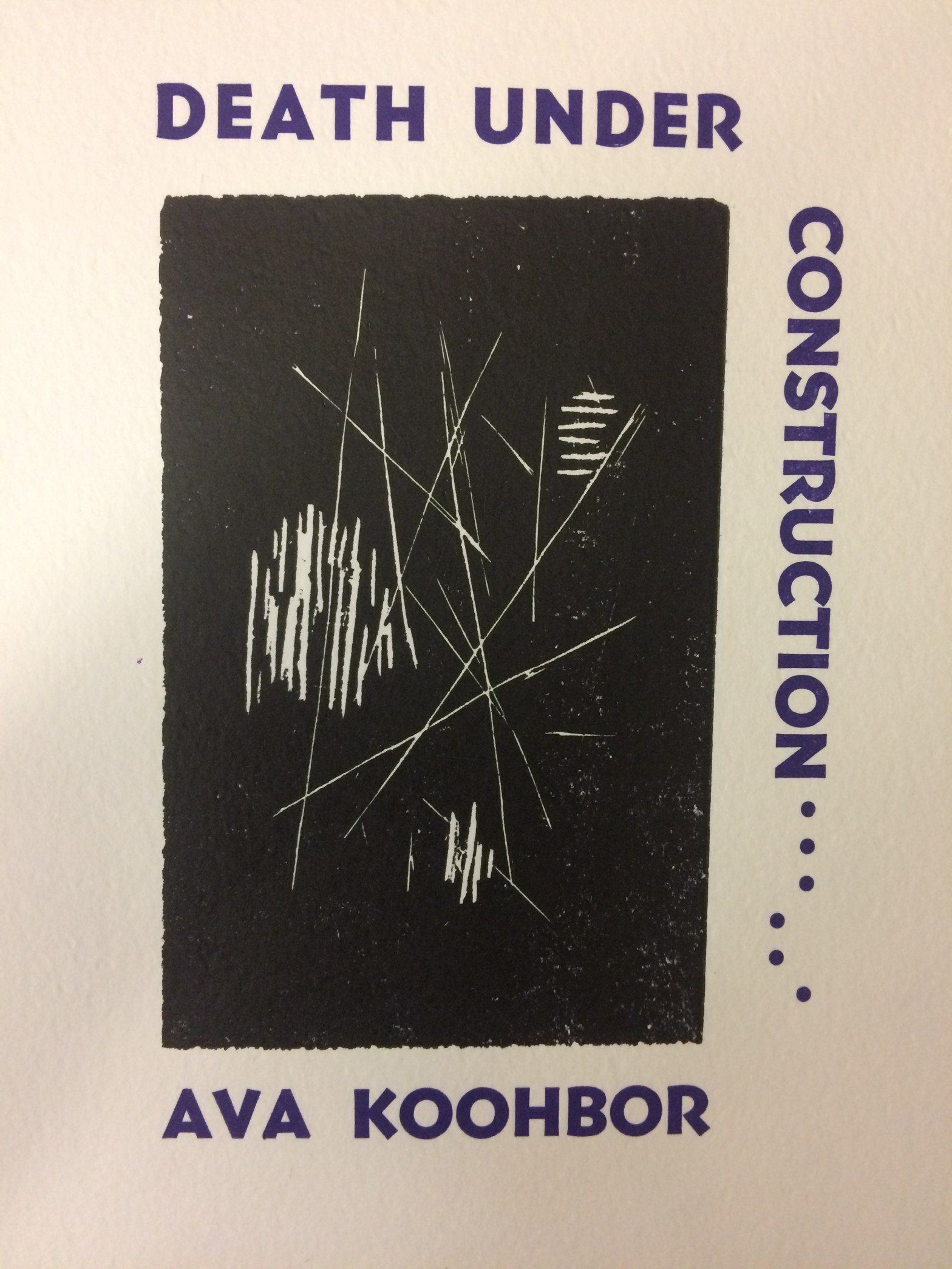 Death Under Construction, by Ava Koohbor - 88 pages, 7x9.5" - perfect bound in two-color letterpress wrappers printed from a linoleum block carved by the author and handset type - co-published with Ugly Duckling Presse in an edition of 600 copies -- available now.